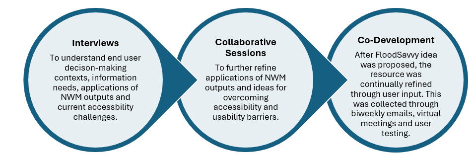 FloodSavvy is the result of a three-phase study that sought to explore how NOAA’s National Water Model could support community resilience planning and how NOAA and the NWC could facilitate this use. The first phase of the project focused on six communities across the US and interviewed professionals who support water- and resilience-related decision-making (Raub et al. 2024). We found that more than 60% of interviewed individuals involved in water-related decision-making and planning had never heard of the NWM. However, once introduced to it, many saw strong potential for how NWM’s flood forecasts and visuals could support their work. Since most of the stakeholders had no experience using the NWM, the second phase worked with a subset of those stakeholders to pilot desired applications of NWM outputs. During this phase, it became evident that first-time users faced barriers in accessing, interpreting, and utilizing NWM information effectively, especially when they lacked specialized hydrological expertise, capacity, time, and resources.